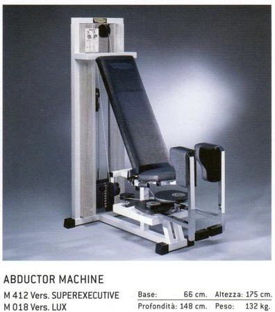 Prodotto specifico per l’allenamento degli abduttori dei glutei. L’esercizio si esegue da seduti effettuando un movimento di apertura e chiusura delle gambe. La resistenza, posta all’esterno delle gambe, è data da un pacco pesi e permette di gestire carichi diversi per ogni tipologia di soggetto.