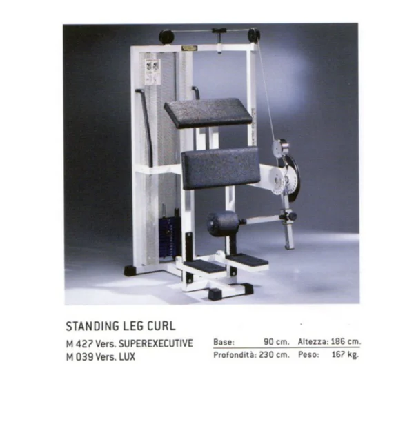 Attrezzo per l’allenamento dei muscoli posteriori della coscia. L’esercizio, eseguito da in piedi con traiettoria guidata, consiste nella flessione ed estensione delle gambe sulle cosce e consente di isolare la muscolatura posteriore della coscia senza interessare la parte bassa della schiena. La resistenza, è data da un pacco pesi e permette di gestire carichi diversi per ogni tipologia di soggetto.